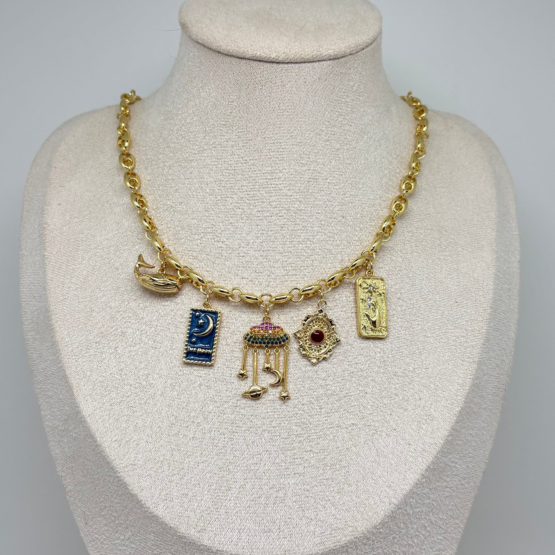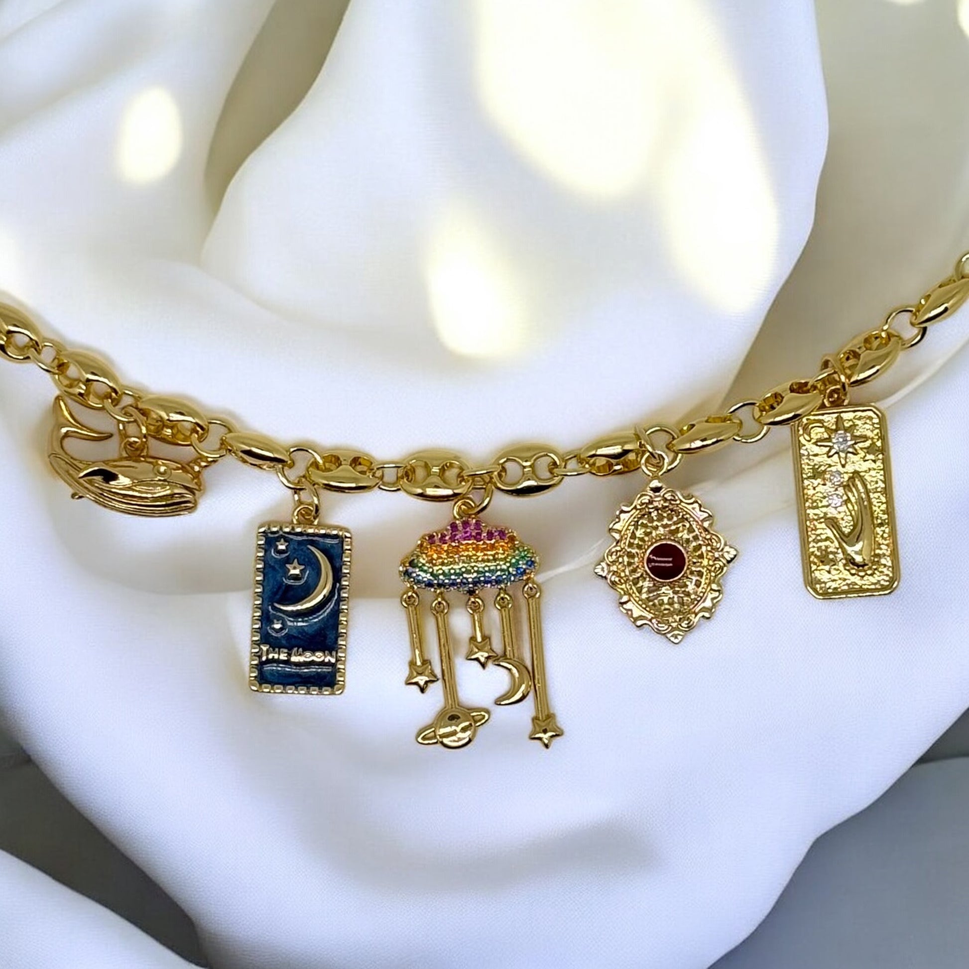 Astrylune is a celestial charm necklace woven with symbols of intuition, wonder and cosmic storytelling. This handcrafted gold-plated piece features a soaring bird for freedom, a deep-navy moon tarot charm, a rainbow crystal dome with dangling stars, a vintage-inspired ruby talisman and a golden cosmic plaque marked with a guiding star. The mix of rich enamel, shimmering stones and textured gold creates an enchanted, star-kissed aesthetic that feels both mystical and empowering. Wear Astrylune as your statement piece whenever you want to channel magic, clarity and your own inner universe.