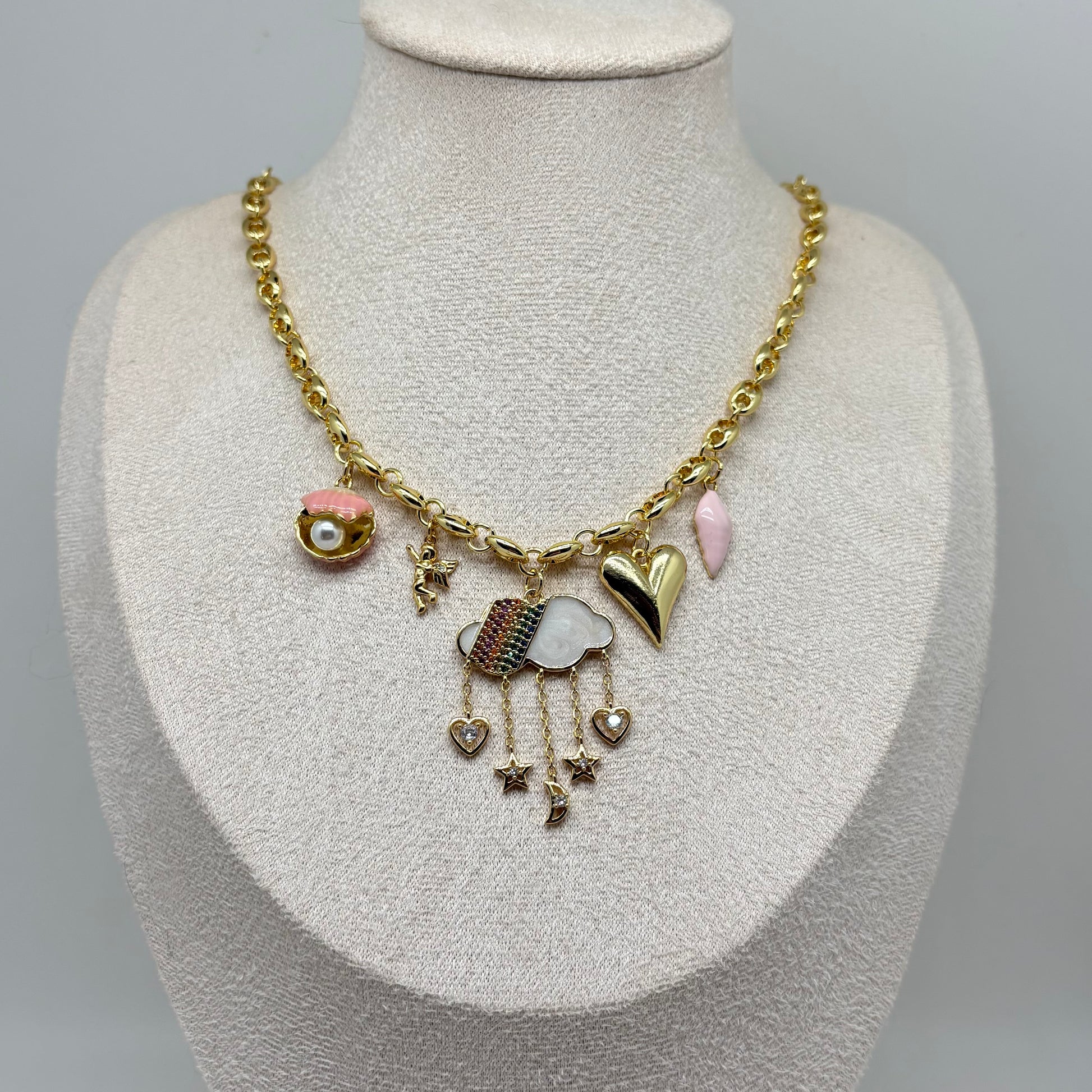 This gold-plated chain features enchanting charms: a rainbow cloud dripping hearts and stars, a golden fairy, a pearl shell, a sculpted heart, and a soft pastel pendant. Each charm represents hope, protection, and a touch of wonder. With its mix of soft enamel pastels, shimmering stones, and high-shine gold, Luméria adds a playful yet elegant sparkle to any outfit.Wear it as a statement piece or layer it for a whimsical, feminine look Luméria is made to shine with you.