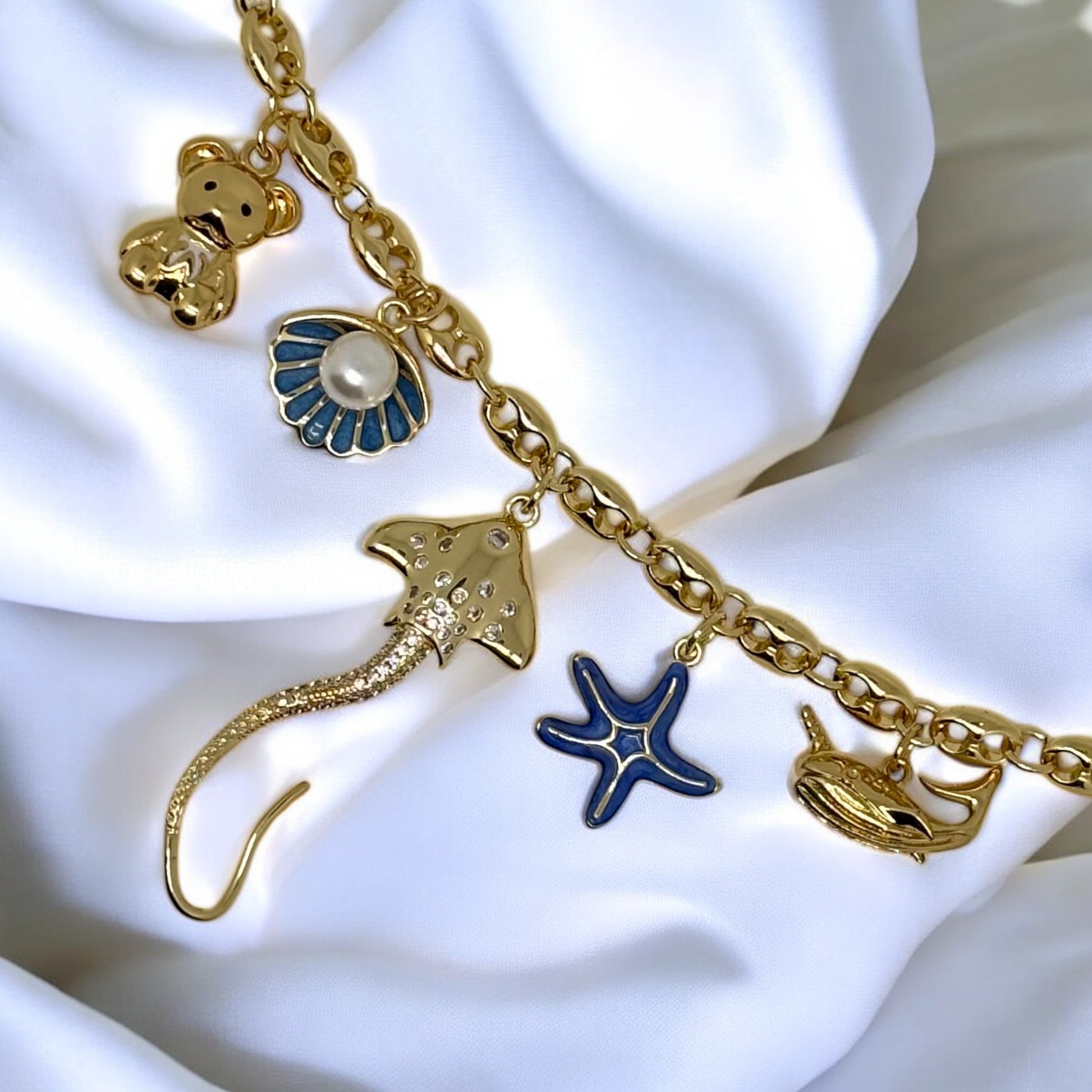 Maribelle is a playful, ocean-inspired charm necklace that blends childhood sweetness with coastal magic. This handcrafted gold-plated piece features a glossy golden teddy bear, a deep-blue seashell with a luminous pearl, a sparkling stingray with a textured tail, a navy starfish accented with gold and a sleek manta ray charm gliding through the chain. The mix of ocean blues, shimmering stones and polished gold creates a soft yet vibrant aesthetic that feels joyful, summery and full of wanderlust. Wear Maribelle as your signature piece whenever you want to radiate warmth, whimsy and breezy seaside energy.