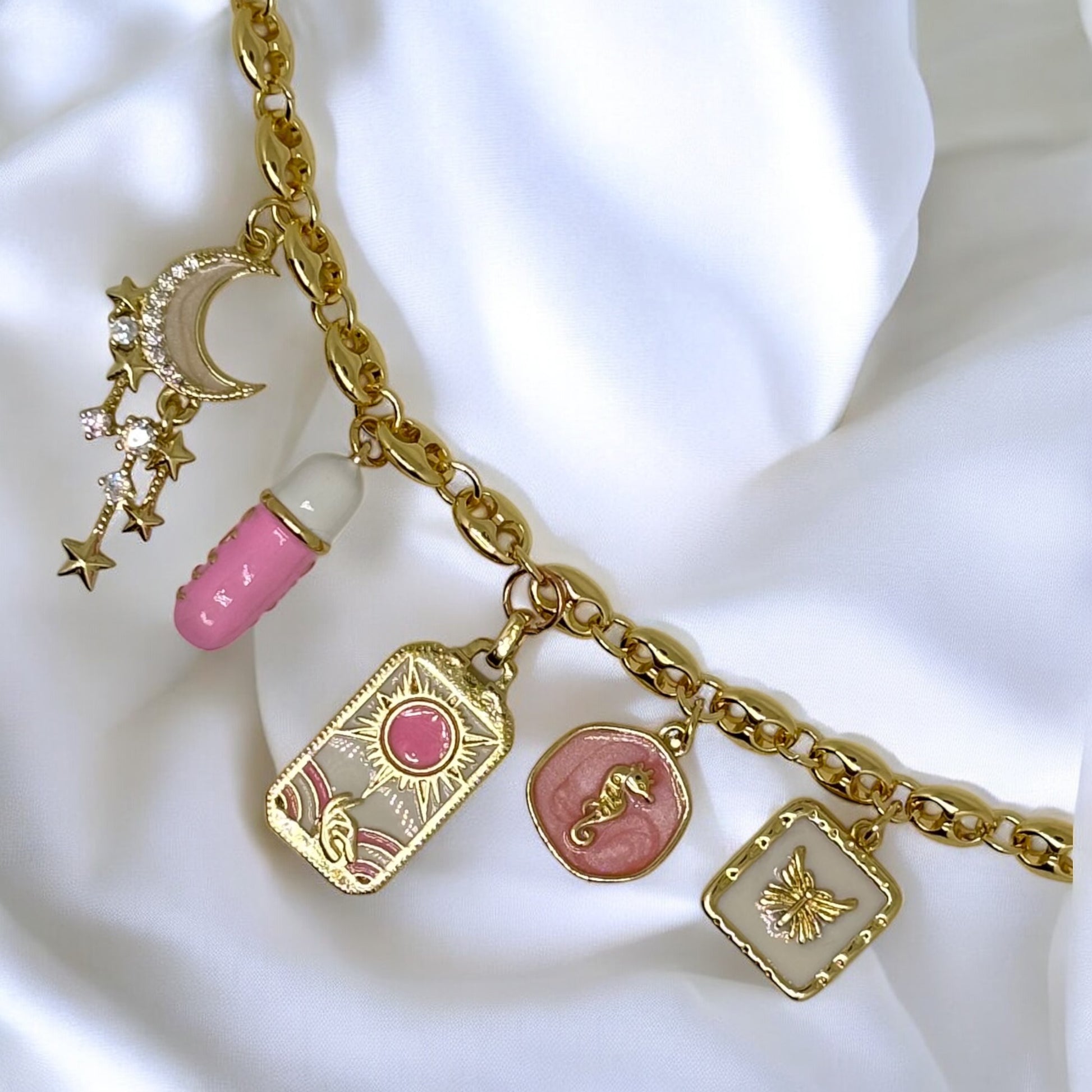 Rosalune is a dreamy charm necklace infused with soft pink magic, celestial light and ocean symbolism. This handcrafted gold-plated piece features a sparkling crescent moon with falling stars, a glossy pink capsule charm, a radiant sun-and-waves talisman, a rose-toned seahorse medallion and a delicate butterfly framed in gold. Together they represent transformation, intuition, femininity and inner strength. With its blend of shimmering stones, pastel enamel and intricate details, Rosalune adds a whimsical yet elegant touch to any look. Wear it as your signature statement piece or layer it for a soft celestial-feminine aesthetic.