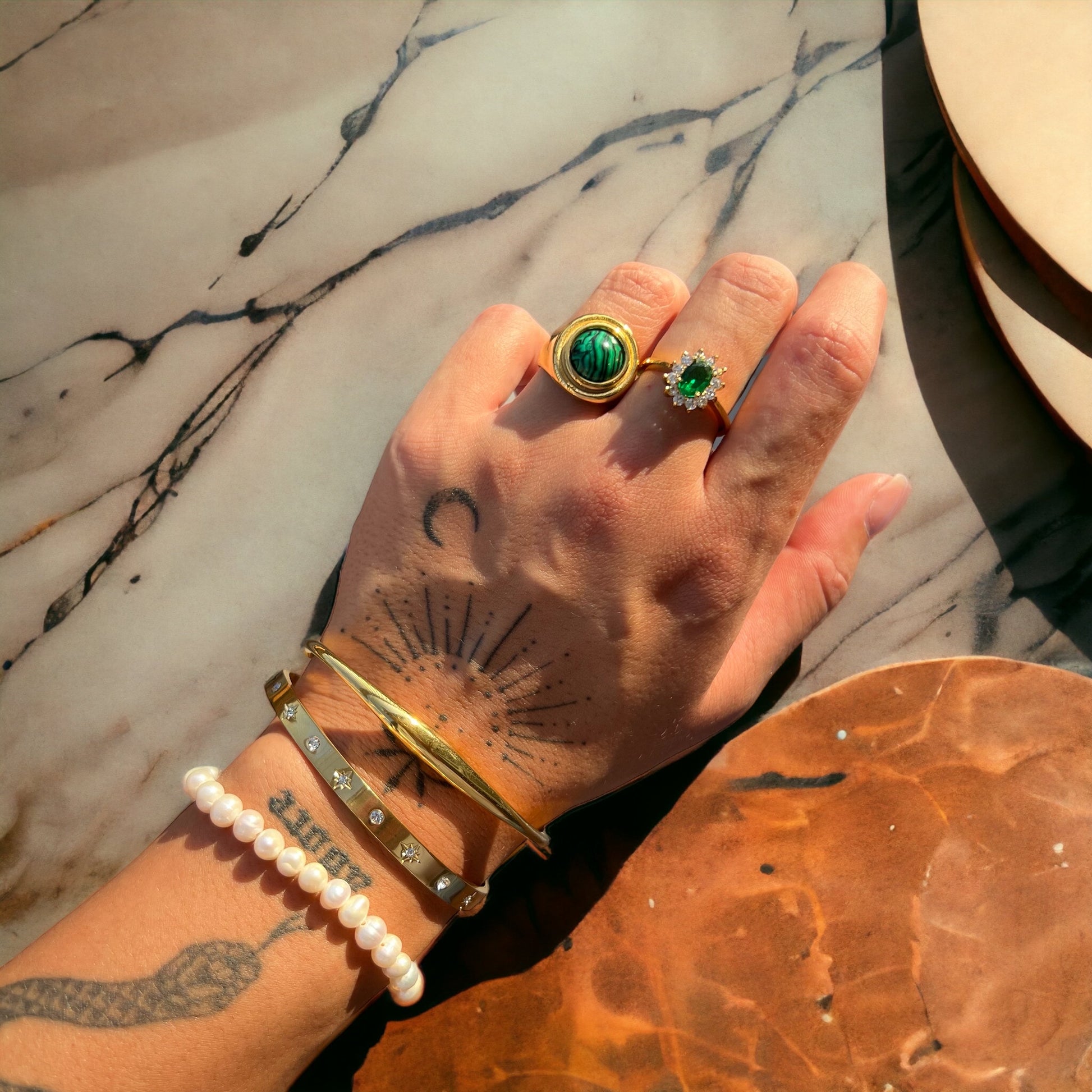 The stunning Saffron Ring featuring a green stones and clear stones to create a dazzling effect. Perfect for special occasions or for adding a touch of glamour to any outfit.